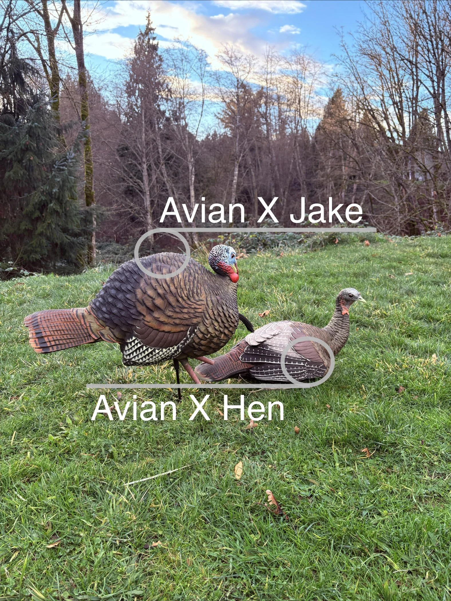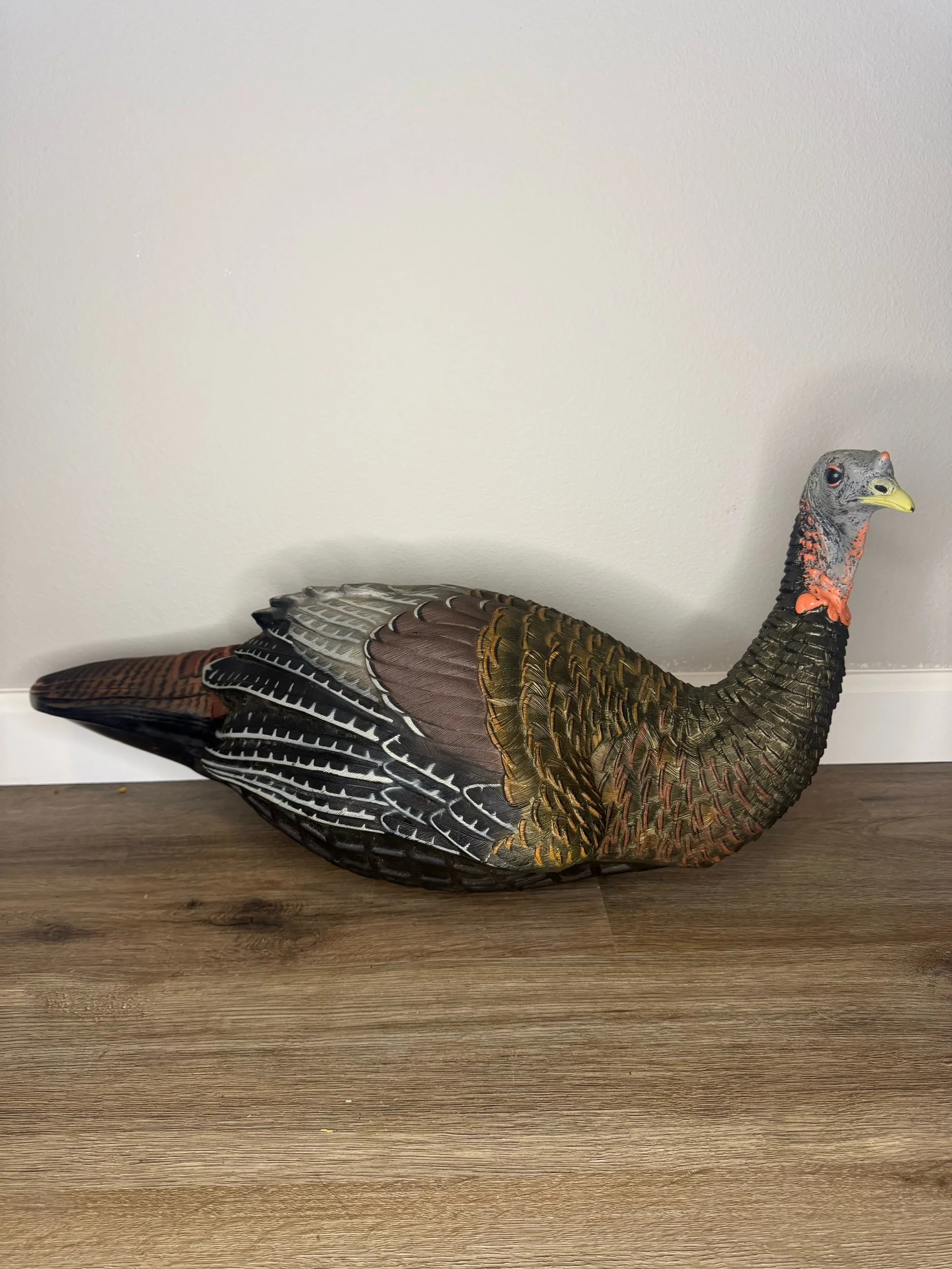 An inflatable Avian-X Laydown Hen turkey decoy. This decoy is in great shape. Has not take any hits. It inflates and deflates as it should, and looks great!